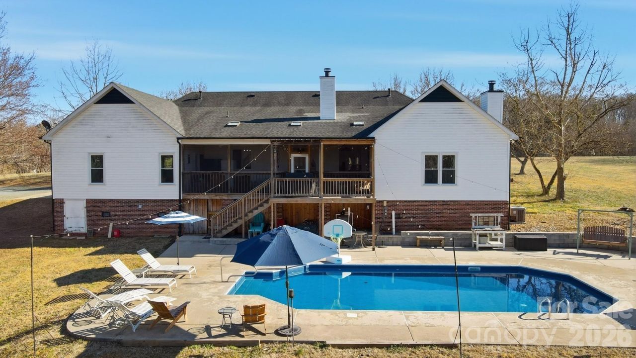 Welcome to country living at its finest with no HOA! This beautiful farmhouse is located on 8+ acres with a warm and thoughtfully designed interior that blends modern updates with timeless charm. Features include 3 bedrooms, 2.5 bathrooms plus an office and a flex space with closet. The split bedroom floor plan allows for privacy with a generously sized primary bedroom with two separate walk-in closets. The ensuite bathroom was renovated in 2021 and features his-and-her vanities, a freestanding soaking tub, and separate walk-in shower. The luxury kitchen was also updated in 2021 featuring quartz countertops and ample cabinet space, plenty of storage and prep area, double ovens, and an induction cooktop. The extra-large family room showcases a gas burning fireplace with custom mantle and beautiful accent wall. Cozy up for family dinners with an additional fireplace in the dining area. There are two generous size secondary bedrooms, an office and a flex space with closet that can be used as a second office or craft/hobby room. Additional interior features and updates include a dedicated laundry space with cabinets for extra storage and most windows were updated in 2021. Enjoying the outdoors is easy from the covered front porch or relax on the large screened in back porch, with dual ceiling fans, overlooking a beautiful, wooded backyard view. Enjoy grilling out on the extended back deck or lounge by the beautiful in-ground pool (new liner). The pool deck also features a pool house to store all of your outside equipment and pool accessories. Cleared acreage surrounding the house is perfect for country living! Plant a garden, add a chicken coop for farm fresh eggs, enjoy your off-road toys or hunt in the woods. Property features an additional septic system that perced for a 2 bedroom on the permit. Perfect to build a mother-in-law suite. Further inspection may be needed to bring system to operational use. Containers and tractor with implements can be negotiated, along with some living room furniture. Great Union County location and Piedmont School assignment!